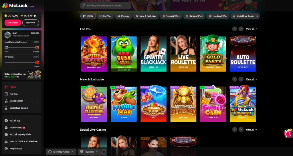 McLuck stands as a dynamic social casino focusing solely on enjoyment through its diverse game offerings. Players can access this platform from various devices, including computers, smartphones, and tablets, which it seamlessly adapts to provide a uniform gaming experience. The inviting interface and vibrant visuals of McLuck pull players into an environment where excitement and joy prevail.